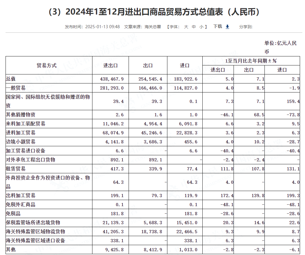 2024年12月,我国进出口商业总值4。07万亿元,同比增加6。8%。此中,出口商业总值为2。41万亿元,同比增加10。9%;进口商业总值为1。66万亿元,
