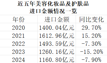 化妆品报查经历史数据发觉,2024年美容化妆品及护肤品类1160。8亿元的进口金额为近五年来的最低值。同时,化妆品进口金额已持续3年呈现下滑趋向。