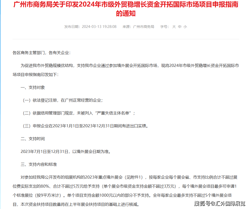 实施了过后补助政策对外贸企业加入《2024年“粤贸全球”广东商品境外展览平台列表》中的境外展会,按单个展位的展位费不跨越80%的比例、最高不跨越3万元的尺度赐与支撑,每家企业统一展会最多支撑2个尺度展位(每个尺度展位9平方米),统一营业年度支撑单个企业加入的“粤贸全球”境外展会准绳上不跨越5个,具体尺度视国度和地域分歧有所区别。